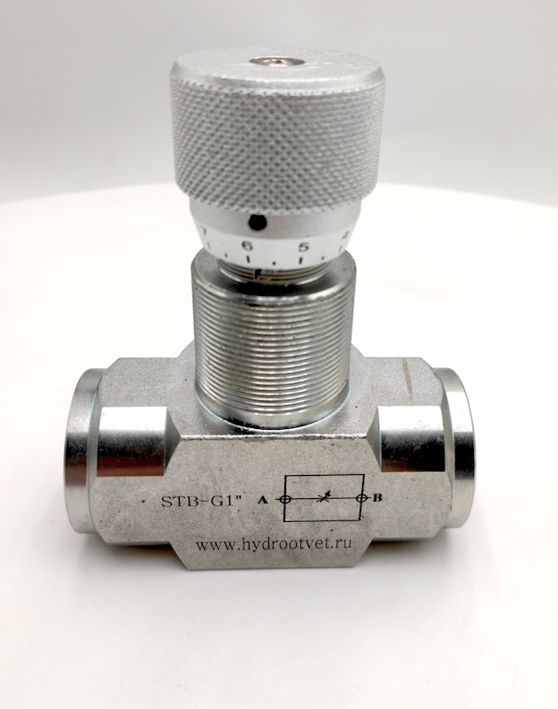 Дроссель трубного монтажа STB-G1-11-1 типоразмера Ду20 с рукояткой предназначен для установки непосредственно в трубопровод при помощи резьбы размером G1. Дроссель STB-G1-11-1 оснащен удобной регулировочной рукояткой со шкалой и фиксатором - это очень удобно, если требуется часто изменять величину расхода масла в гидросистеме, например, на стенде или при смене обрабатываемой детали в станке. Дроссель STB-G1-11-1 выполнен без обратного клапана и регулирует поток в обоих направлениях. Дроссели STB-G1-11-1 служат для бесступенчатой регулировки расхода масла в гидросистеме, то есть скорости исполнительного механизма (гидроцилиндра, например). Регулятор STB-G1-11-1 выполнен из стали 45 и имеет серебряно-цинковое покрытие. Клапаны STB-G1-11-1 производятся в Китае на ведущем заводе-изготовителе гидроаппаратуры, с которым сотрудничает магазин Эксима Маркет, и являются качественными аналогами одноименного клапана известного немецкого бренда.